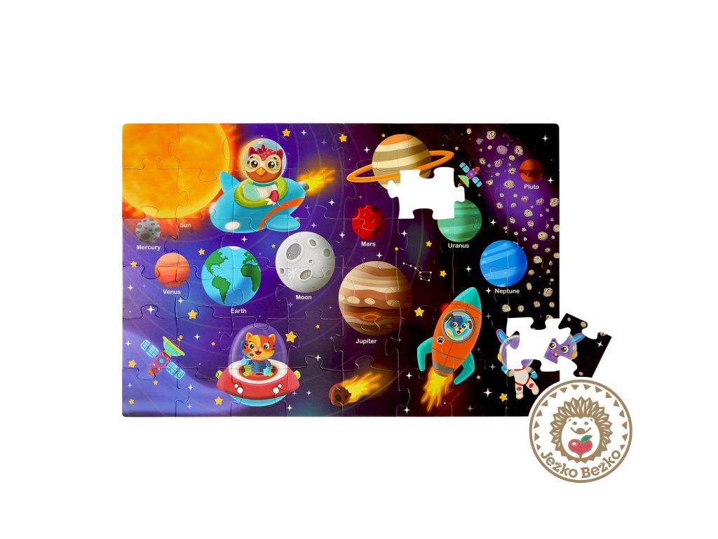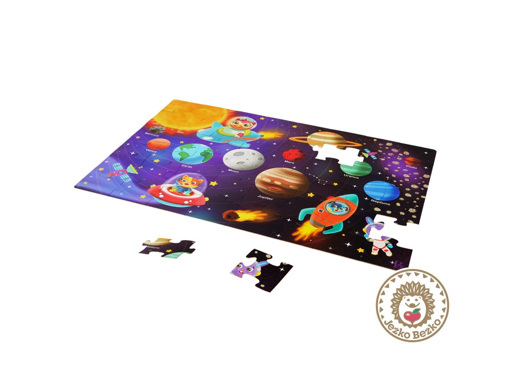 Pripravte sa na cestu vesmírom s maxi puzzle s krásnymi ilustráciami slnečnej sústavy, kozmických lodí a priateľských zvieracích astronautov! Extra veľké diely z pevného kartónu tvoria plochu 91,4 x 60,9 cm a sú tak ideálne na skladanie na podlahe.