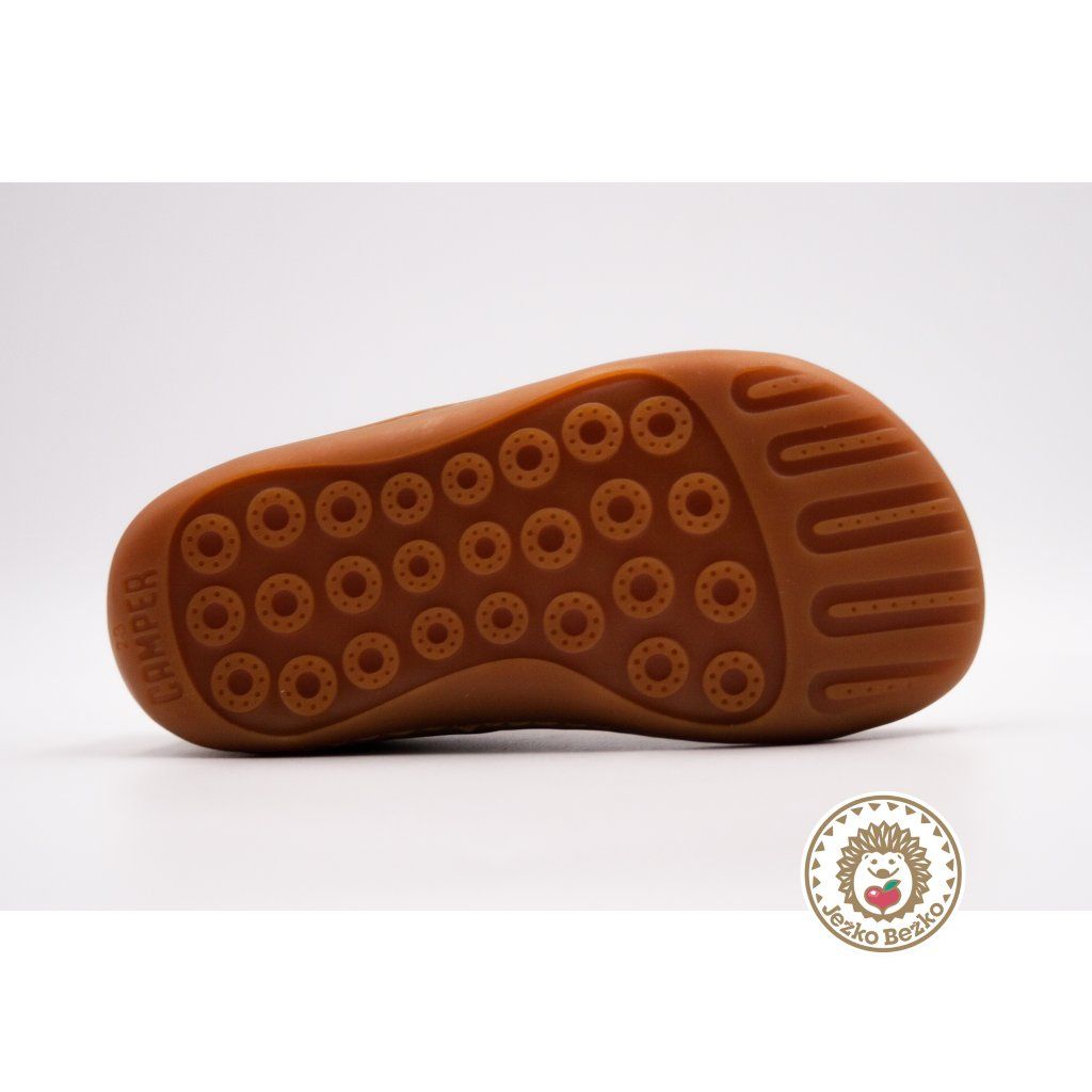 Doslova úžasné topánky na prvé kroky. Majú ohybnú gumenú podrážku, ktorá je vpredu vytiahnutá vyššie, aby chránila palček, aj topánky proti okopu. 20 % z podrážky tvorí recyklovaný materiál, keďže Camper sa neustále snaží znižovať spotrebu nových materiálov.