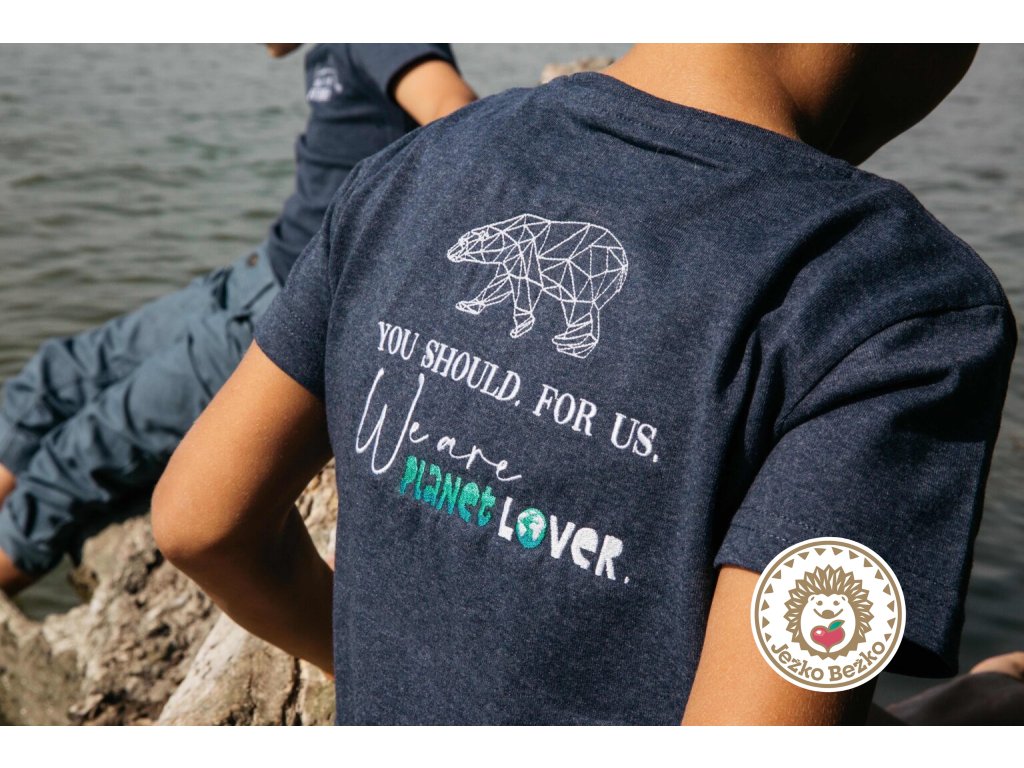 Na zadnej strane trička je vyšitý nápis: “You should. For us. We are Planet Lover” (“Mali by ste sa. Pre nás. My sme Planet Lover”). Text je opäť doplnený vyšitým grafickým prvkom – ľadového medveďa, ktorý je symbolom topenia ľadovcov a prebiahajúcej klimatickej krízy.