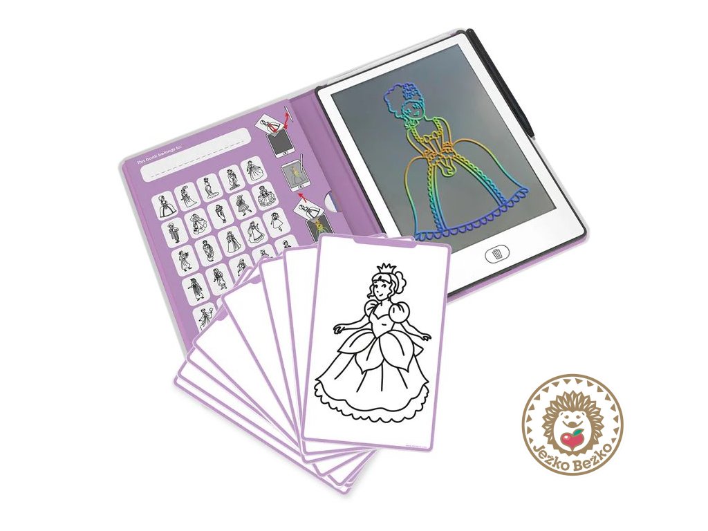 Táto ľahká a prenosná kresliaca knižka s LCD displejom ponúka 30 prenášateľných obrázkov v 7 originálnych témach – od zvieratiek a dinosaurov až po princezné, galaxií či pirátov.