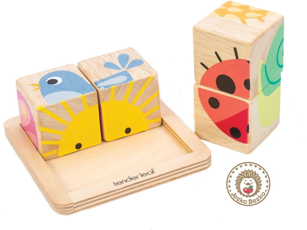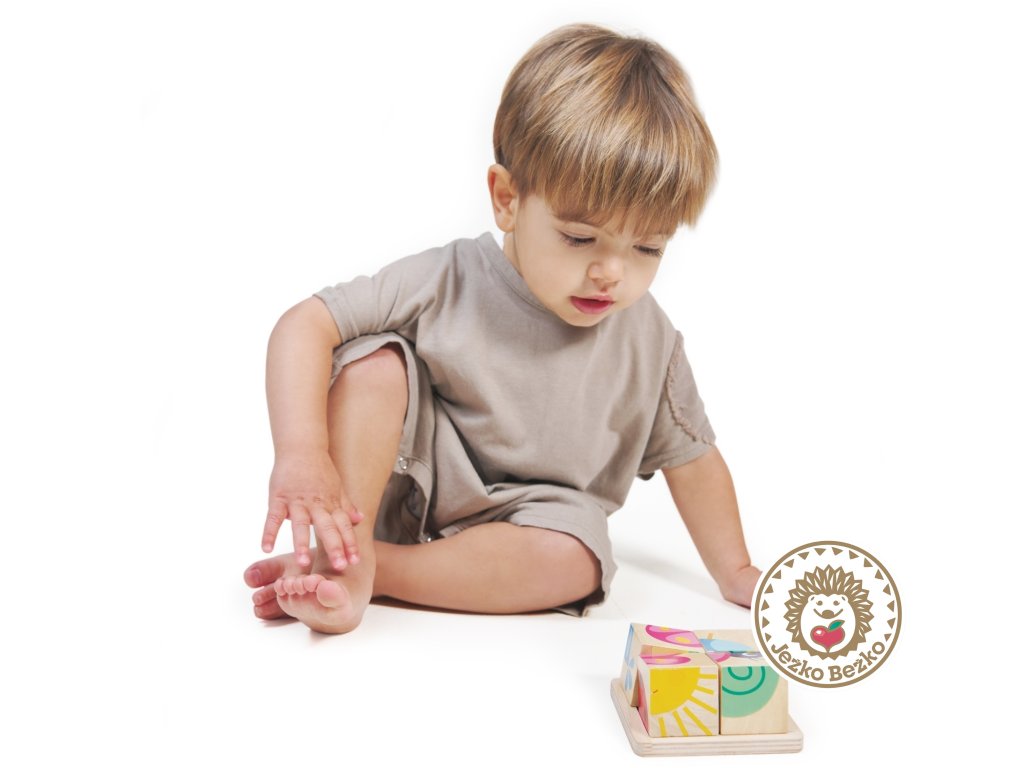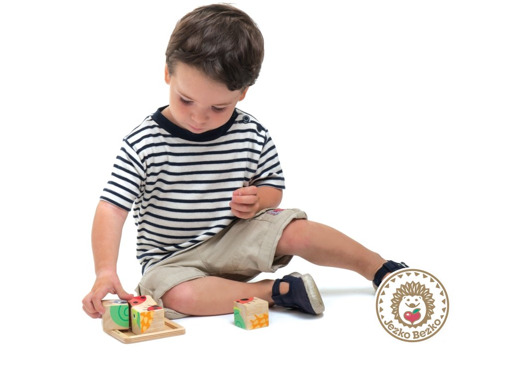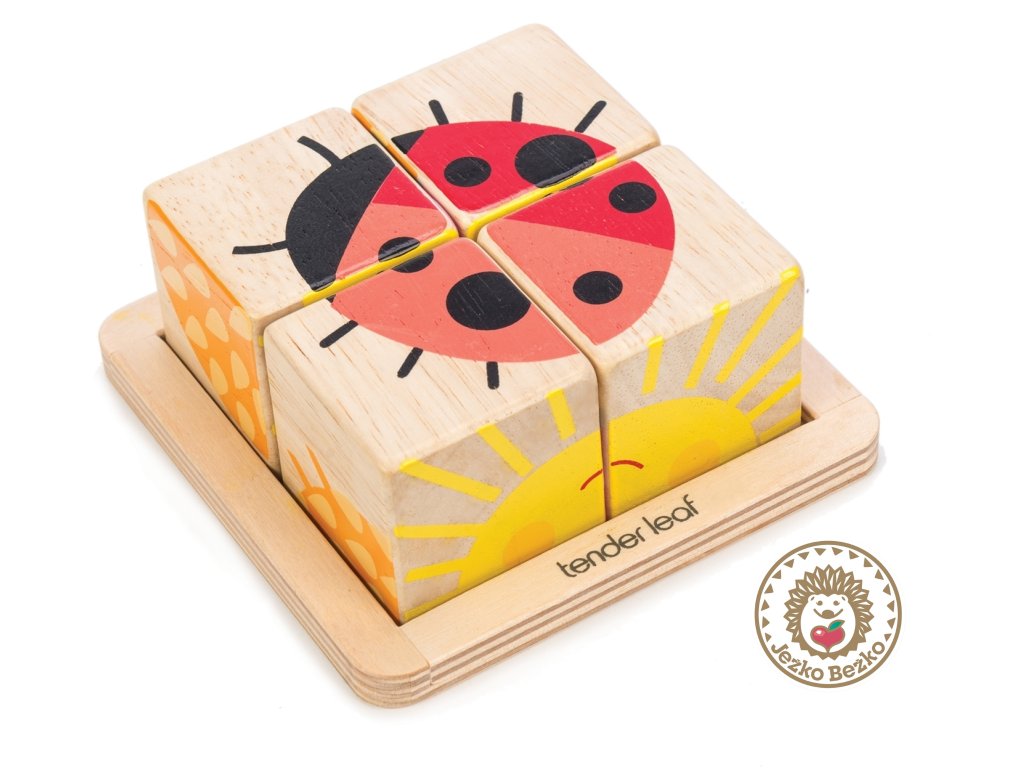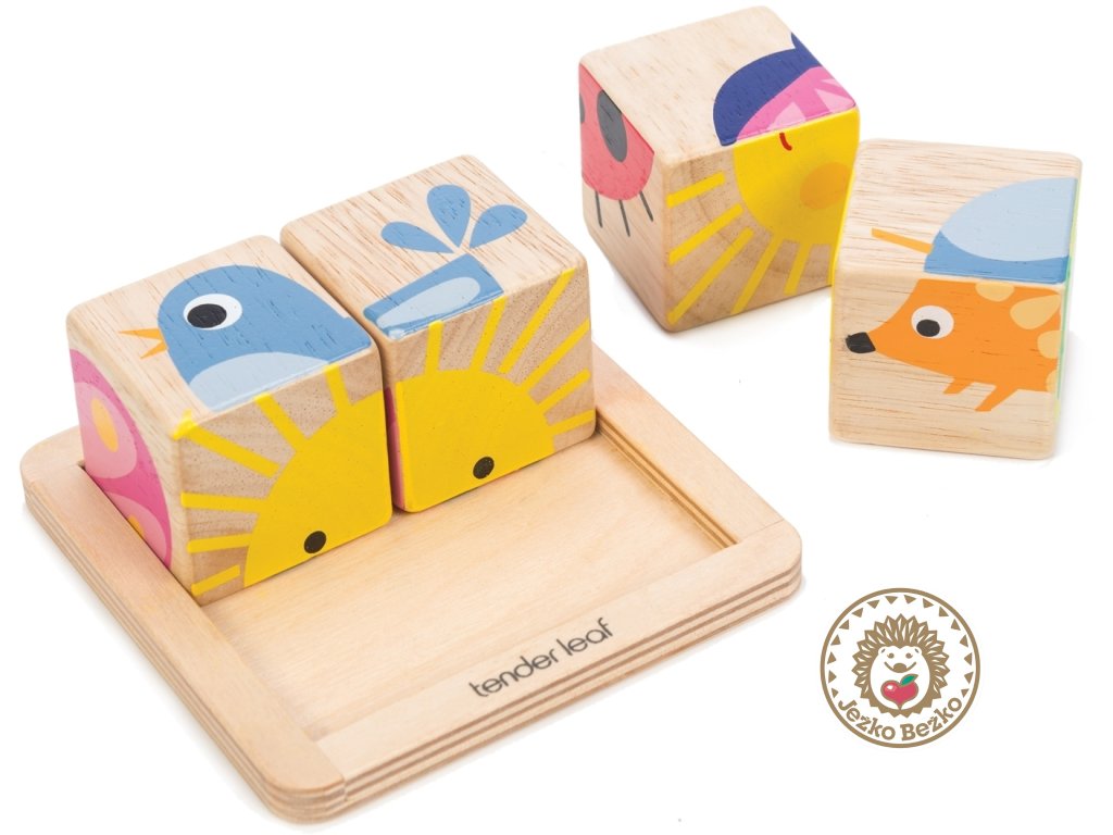 Štyri kocky na drevenom podnose, z ktorých možno poskladať šesť jednoduchých obrázkov, sú ideálne ako prvé puzzle pre batoľatá. Okrem toho môžu kocky stavať na seba a opäť ich zhadzovať - skvelá zábava! Skladanie obrázkov pomáha rozvíjať kognitívne myslenie, zatiaľ čo skladanie a vkladanie kociek zlepšuje jemnú motoriku a koordináciu oko-ruka.
