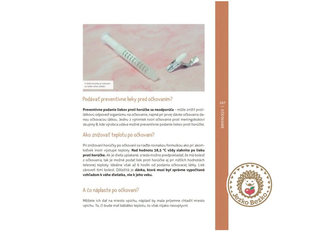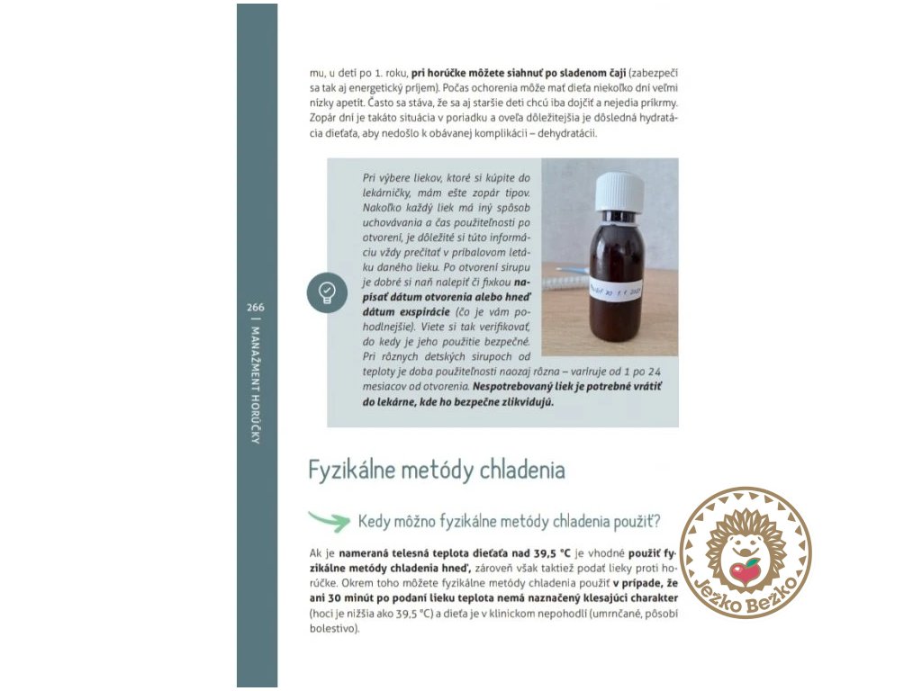 ako je to so sledovaním TV, s hračkami a vývojom reči. - Manažment horúčky – kapitola, združuje informácie o horúčke, ktoré by mal vedieť každý jeden rodič. Ponúka zoznam dostupných liekov a ich správne dávkovanie a užívanie. Dozviete sa tiež ako robiť zábaly či kedy ich vôbec nerobiť. Dočítate sa, aké sú najčastejšie otázky a chyby rodičov z praxe ohľadom znižovania teploty u detí a rôzne iné tipy z praxe.