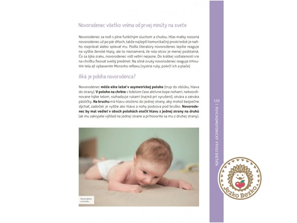 - Psychomotorický vývoj – kapitola ozrejmuje na čo má dať rodič vo vývoji dieťaťa dbať, na čo upozorniť pediatra a tiež, kedy je vhodné kontaktovať fyzioterapeuta. Zároveň citlivo oboznamuje rodiča s možnosťami podpory vývoja,
