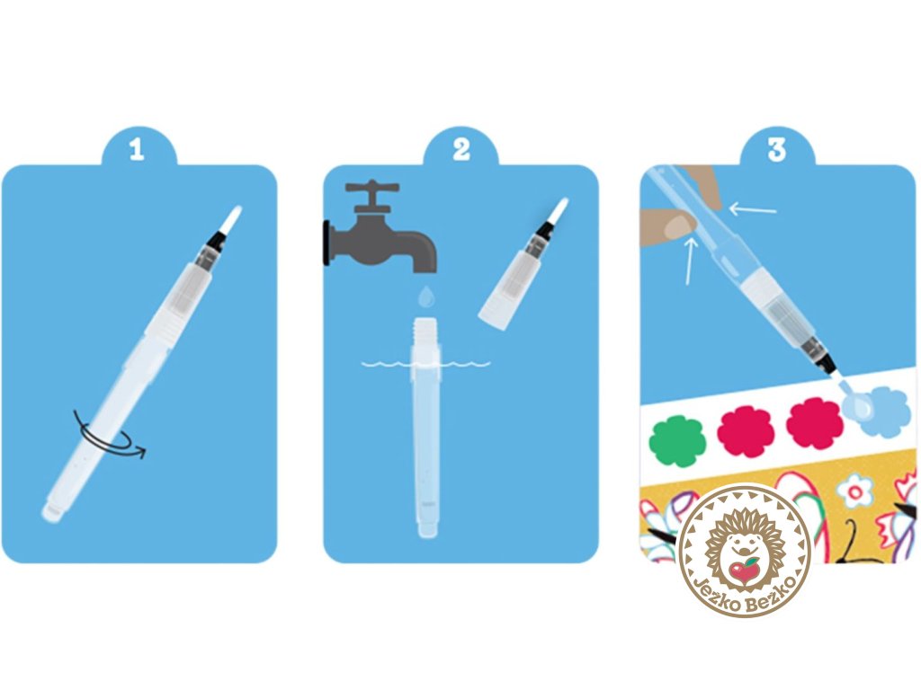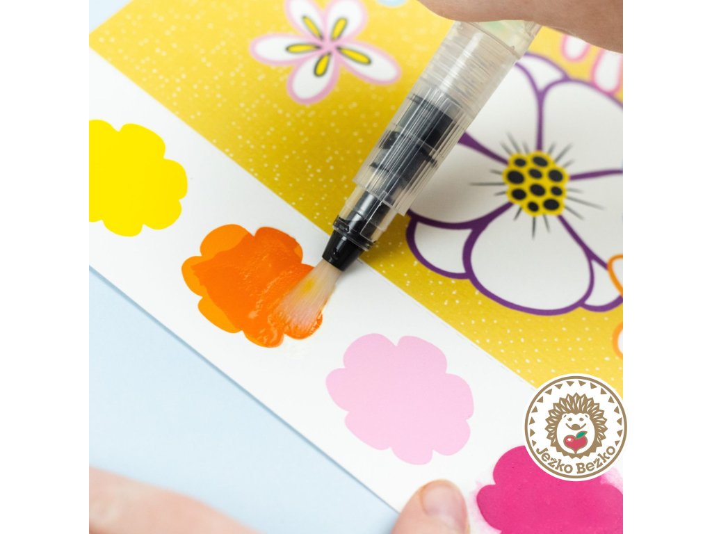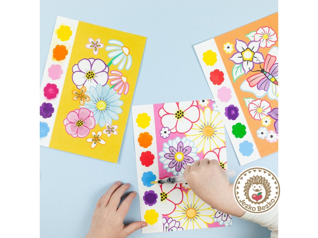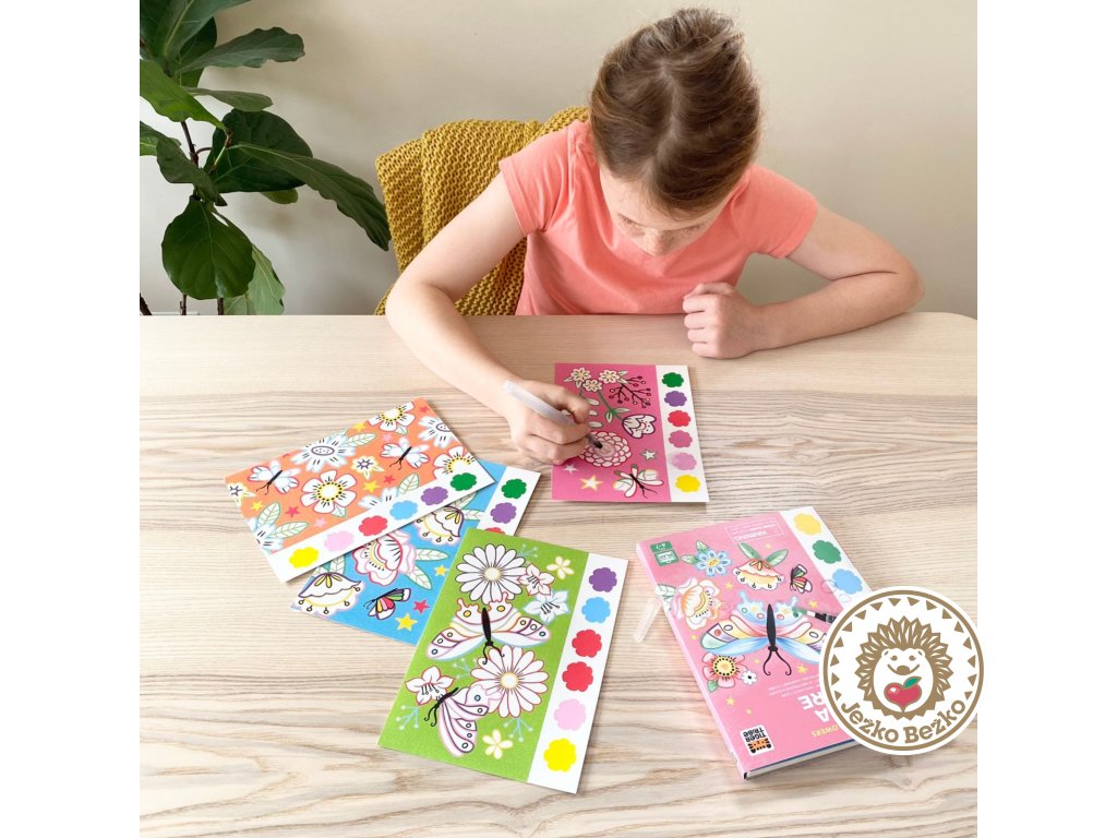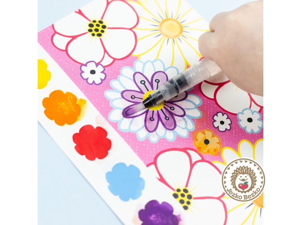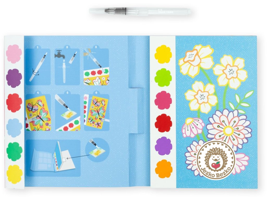 Sada obsahuje 16 strán s ilustrovanými motýľmi a kvetmi, 6 farebných pigmentov na stranu, čarovný vodný štetec a hubku.