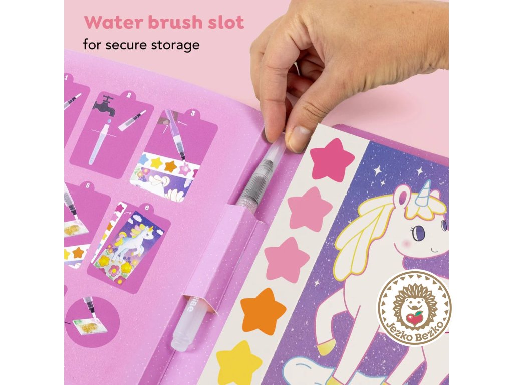 Táto unikátna súprava je skvelým úvodom do maľovania pre malých umelcov. Obsahuje 16 strán s krásnymi jednorožcami v pastelovom dizajne. Každá ilustrovaná karta s motívom má vlastnú vstavanú paletu akvarelových farieb so šiestimi žiarivými farbami, ktoré sa aktivujú vodnou kefou.