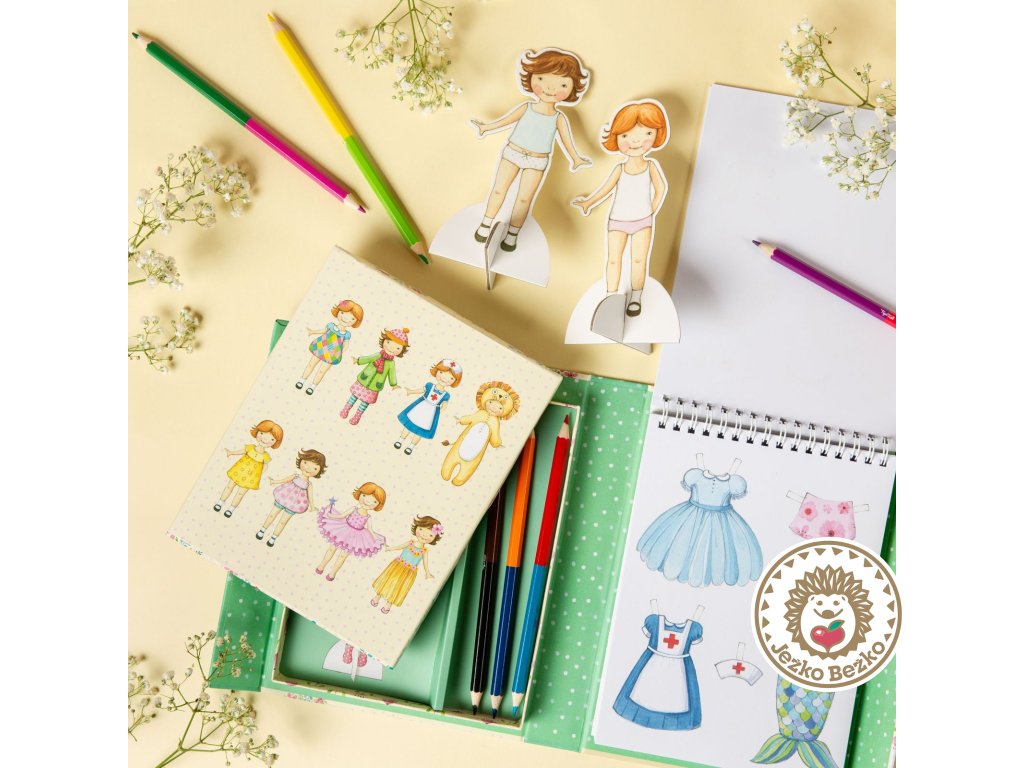 So sadou papierových bábik a množstvom krásneho oblečenia si užijete veľa zábavy. Sada je plná ilustrovaných odevov, ktoré si môžete ozdobiť samolepkami a pastelkami. Oblečenie je potrebné najprv vystrihnúť a potom jednoducho obliecť na bábiky pomocou papierových pútok, ktoré môžete kedykoľvek vyzliecť a vymeniť.