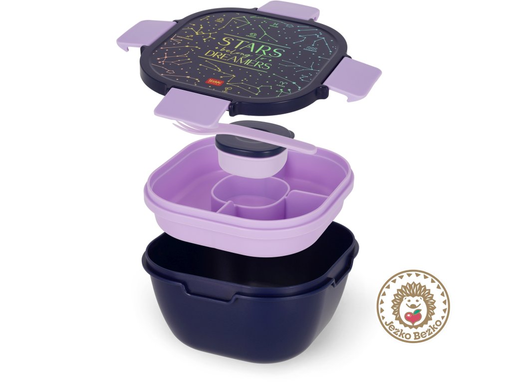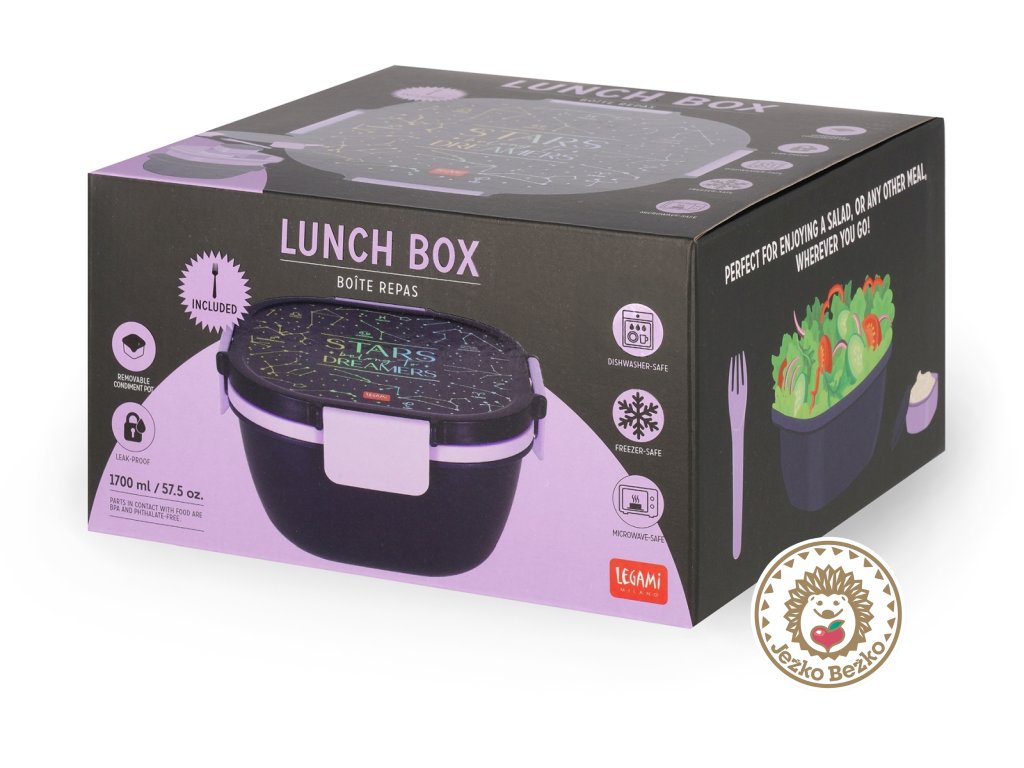 Krabička na desiatu Legami Lunch Box 1700 ml s vidličkou, mini krabičkou na omáčky alebo korenie a organizérom. Misa je vhodná do mikrovlnnej rúry, umývačky riadu a mrazničky.