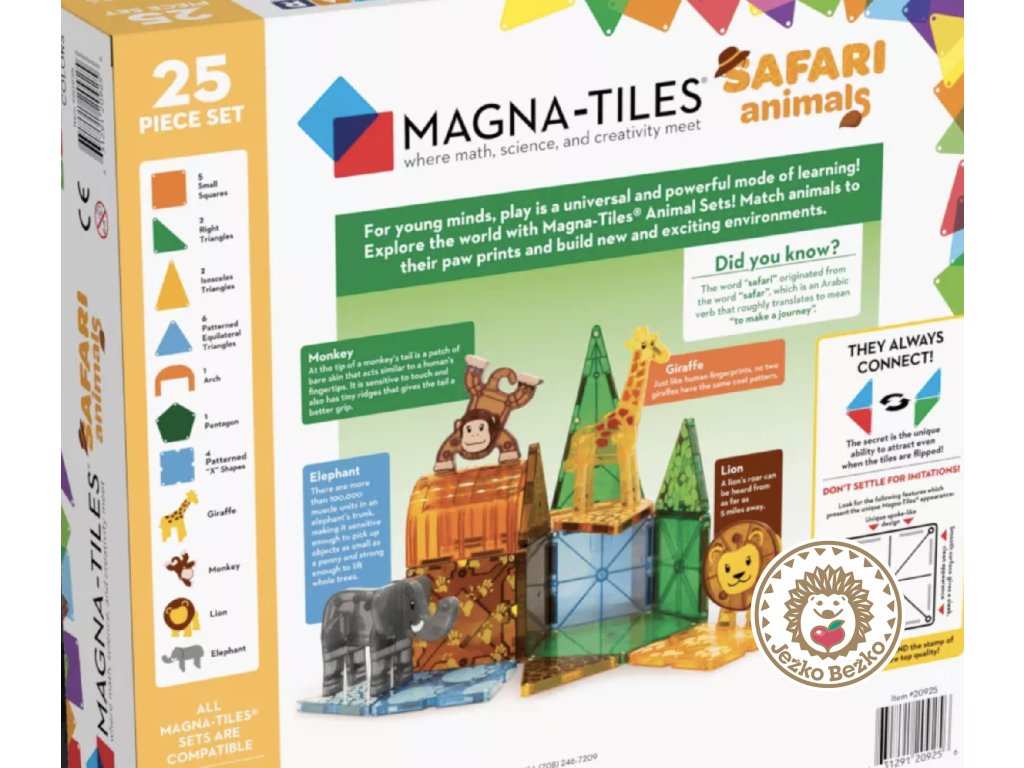 Úžasná 25 dielna stavebná súprava Stavebnica Magna-Tiles® Safari Animals! Nepoznáme lepšiu stavebnicu, ktorá by detičky natoľko pohltila do hry ako Magna-Tiles®. Magnetická stavebnica pre deti prináša hodiny nápaditej a sústredenej zábavy. Deti sa môžu hrať samé alebo s kamarátmi, či rodičmi. Neexistuje žiadna hranica pre detskú kreativitu. Vymýšľajte stále nové a nové varianty, a rozmanité stavby. Súčasťou tejto sady sú safari zvieratká. Zvedavé deti tak môžu stavať každému zvieratku stanovište v žiarivých farbách. Pre malých dobrodruhov s divokou predstavivosťou je africká savana ideálnym miestom na hranie. Deti sa navyše naučia fakty o divokých safari zvieratkách.