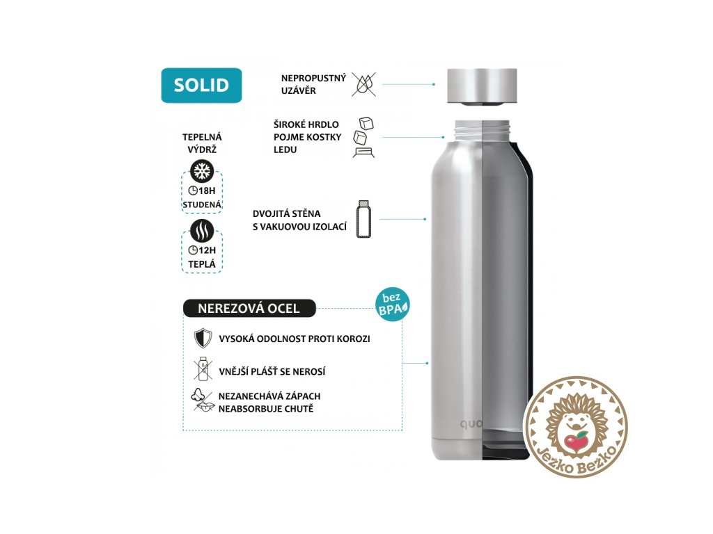 Termoska Quokka Solid z vysoko kvalitnej dvojstennej ocele so spoľahlivým, 100% tesniacim uzáverom udrží váš nápoj podľa potreby teplý či studený. Široké hrdlo umožňuje vloženie kociek ľadu. Termoska udrží teplotu studeného nápoja s ľadom až 48 hodín, studeného nápoja až 18 hodín a teplého nápoja až 12 hodín.