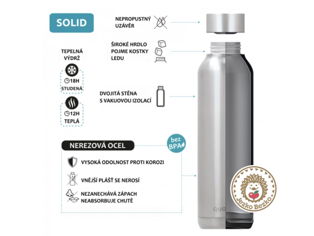 Termoska Quokka Solid z vysoko kvalitnej dvojstennej ocele so spoľahlivým, 100% tesniacim uzáverom udrží váš nápoj podľa potreby teplý či studený.