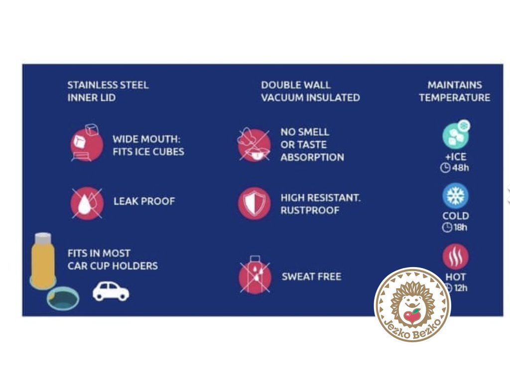 Termoska udrží teplotu studeného nápoja s ľadom až 48 hodín, studeného nápoja až 18 hodín a teplého nápoja až 12 hodín.