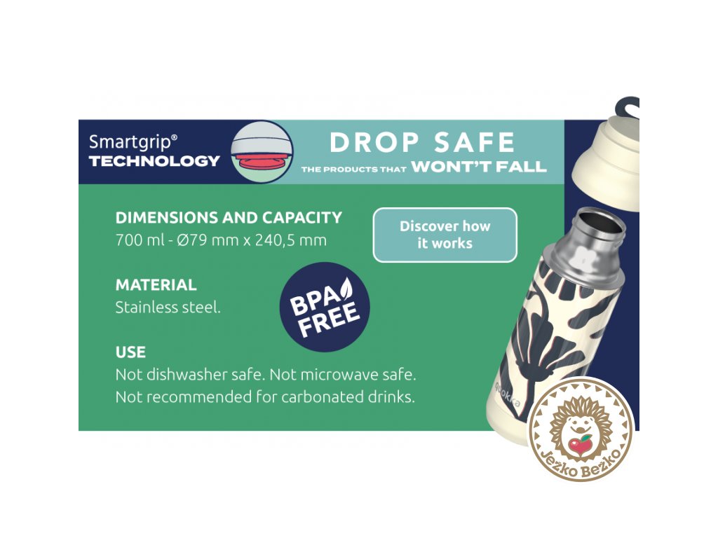 Quokka Pulse je súčasťou kolekcie fliaš a hrnčekov Drop Safe so špeciálnym dnom Smartgrip®, ktoré pri postavení na hladký povrch bránia prevrhnutiu a nechcenému vyliatiu obsahu fľaše.