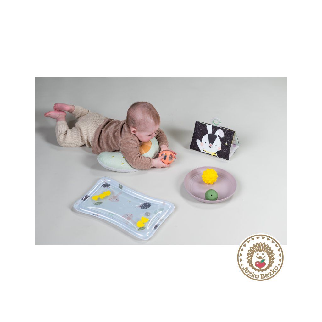 Vankúšik z mäkkého, príjemného materiálu je špeciálne navrhnutý, aby podporoval hranie dieťaťa na brušku.Obojstranná šuštiaca kniha je ideálna pre postavenie pred dieťa v polohe na brušku. Množstvo obrázkov, ktoré kniha ponúka, umožňuje rodičom obrázky vymieňať a udržiavať tak dlhšie pozornosť dieťaťa. Hru na brušku podporuje aj vodná hracia podložka s výraznými žltými kvetmi, ktoré sa vo vode pri stlačení podložky pohybujú a upútavajú tak pozornosť dieťaťa.