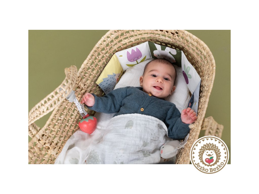Obojstranná textilná knižka aj hrkálka v podobe zajačika vaše dieťa zabaví a poskytnú mu vizuálnu aj hmatovú stimuláciu.