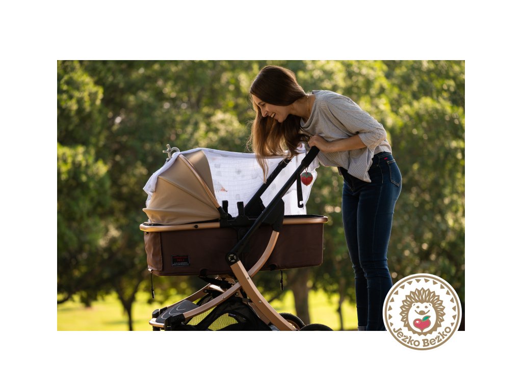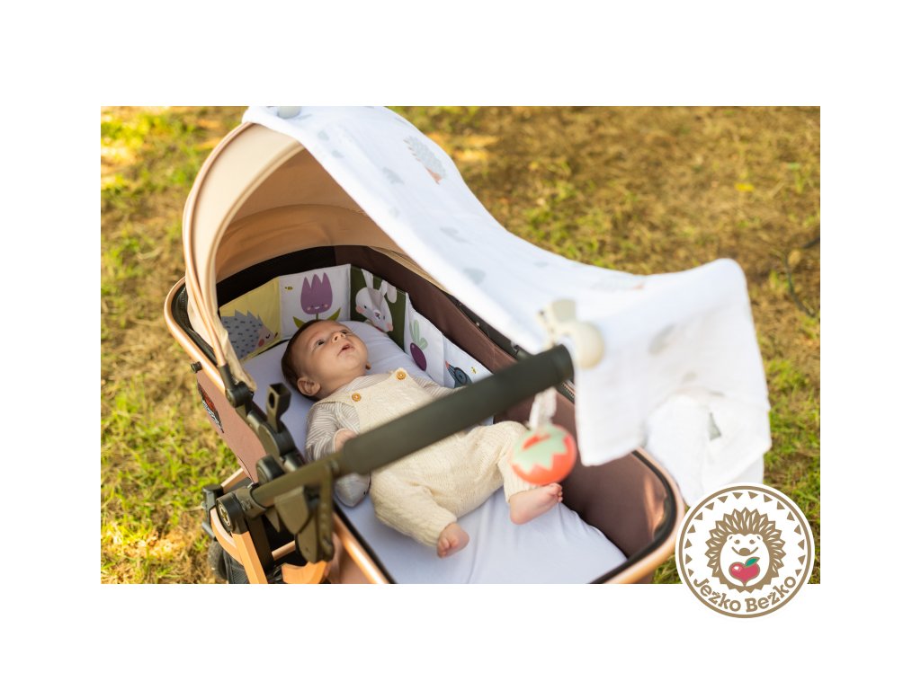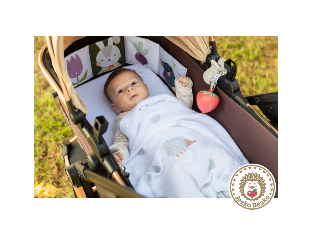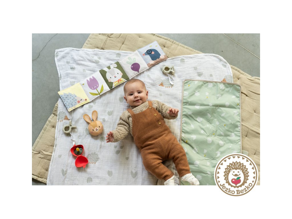 Sadu tvorí veľká textilná plienka, prebaľovacia podložka, dva plastové klipy, puzdro na cumlík v podobe závesnej jahôdky, hrkajúci zajačik a obojstranná textilná knižka do kočíka.