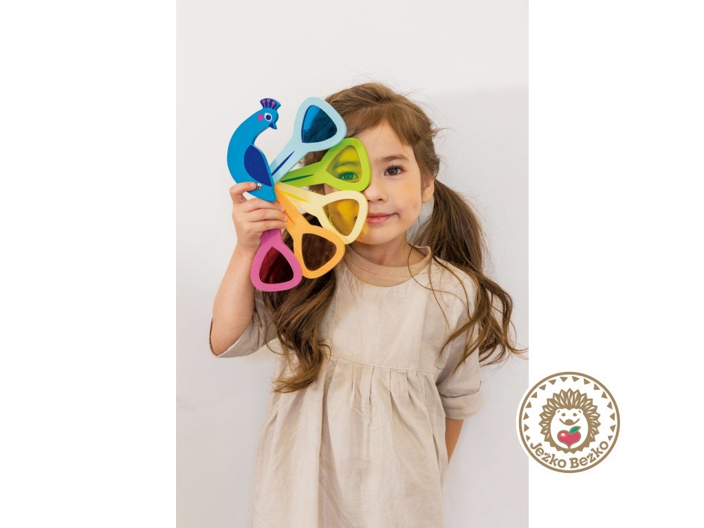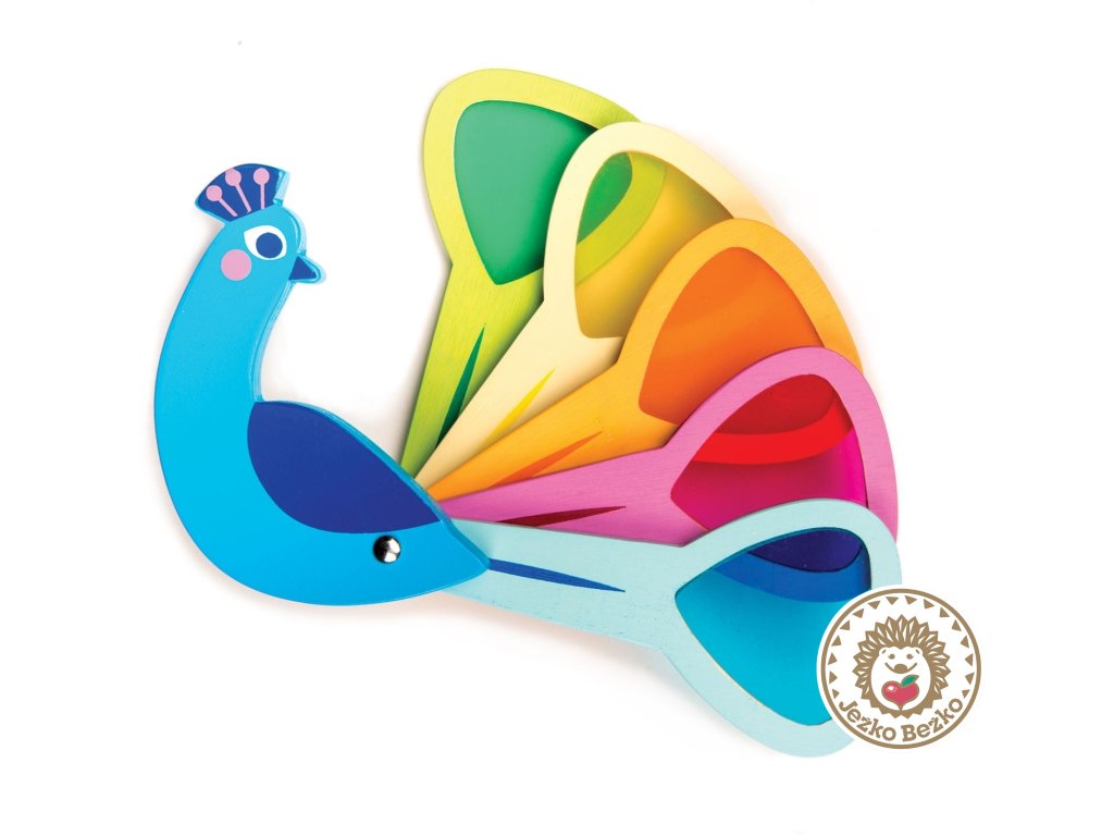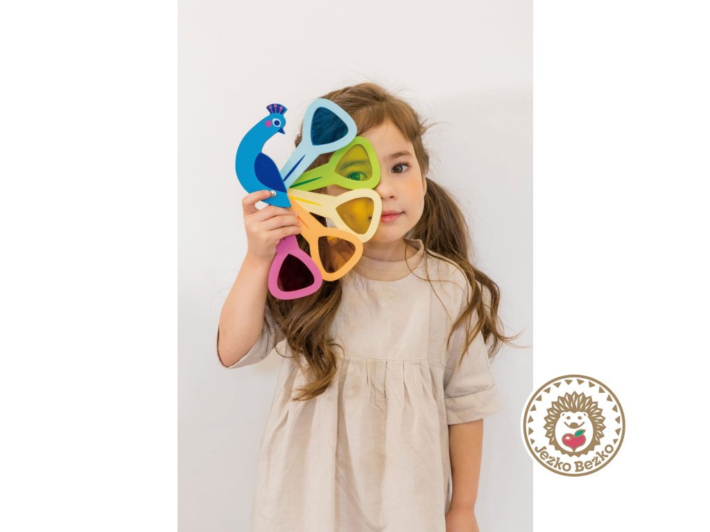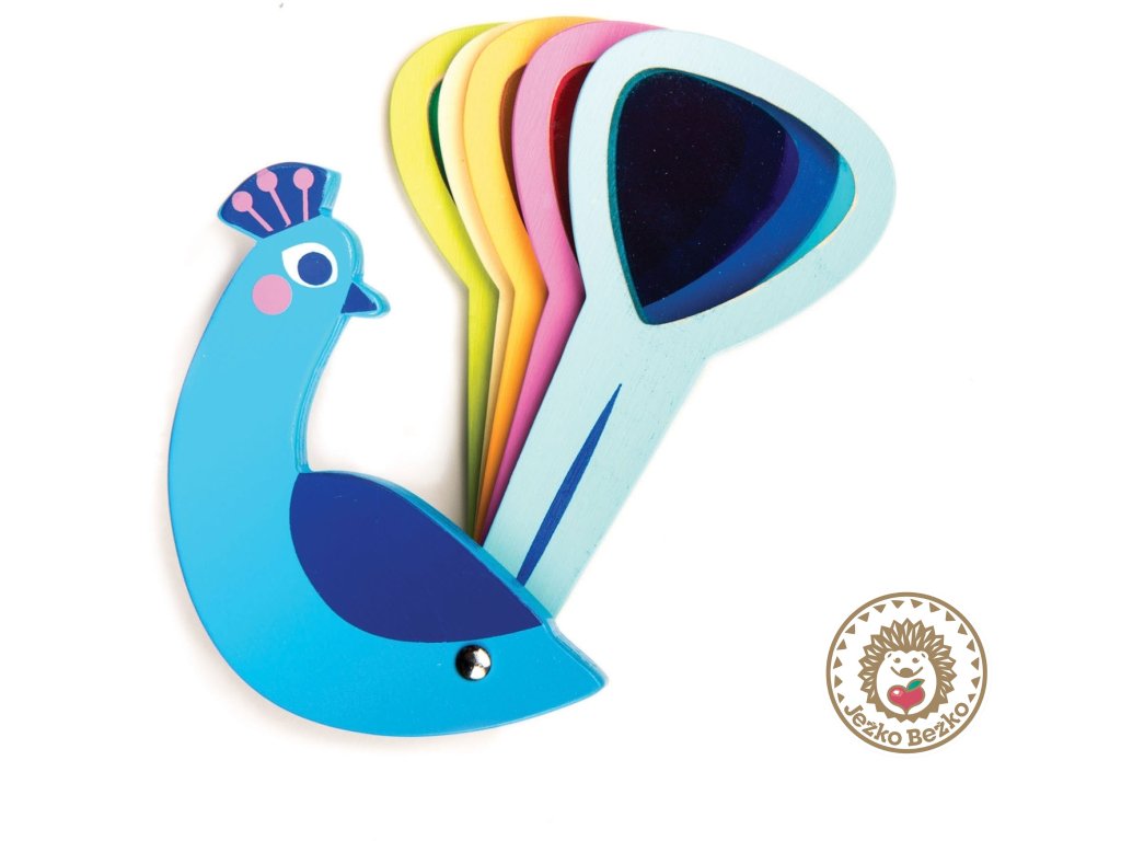 Veselý páv má päť chvostových pier s farebnými priesvitnými okienkami, ktoré sa dajú otvárať a zatvárať rovnako ako u skutočného páva. Skvelá hračka pre deti, ktoré sa učia rozpoznávať farby a chápať, ako funguje miešanie