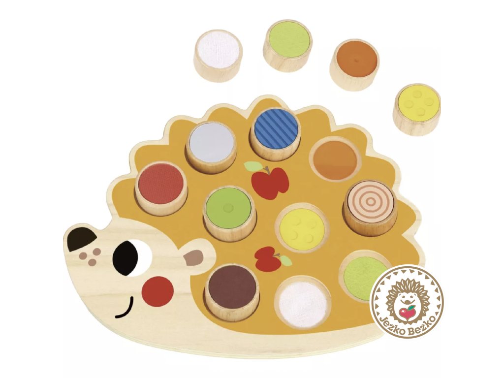 Na desiatich valčekoch sa nachádza desať rôznych druhov materiálov a povrchov, rovnako ako na drevenej podložke v tvare ježka. Úlohou dieťaťa je rozpoznať hmatom jednotlivé materiály a priradiť drevené valčeky do príslušných otvorov na ježkovi.