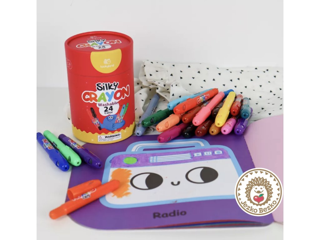 Každá voskovka je uložená do ochranného puzdra, z ktorého sa vysúva jednoduchým otáčaním. Vďaka tomu sa nelámu. Pri kreslení si deti precvičujú motorické zručnosti a predstavivosť. Set obsahuje 24 kusov voskoviek, ktoré sú uložené v praktickom boxe. Všetky voskovky tak vždy nájdete na svojom mieste.